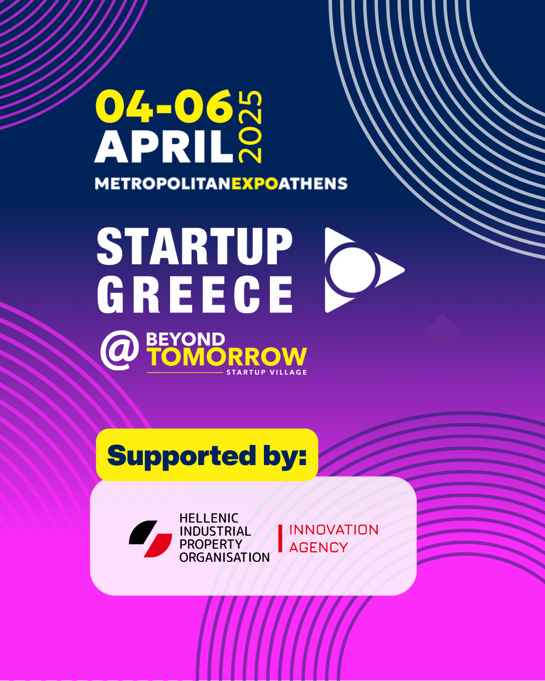 We would like to inform you that the Hellenic Industrial Property Organisation (OBI) is participating in the international digital technology and innovation exhibition Beyond 2025, which will be held for the first time in Athens from April 4-6, 2025, within the framework of the “Startup Greece at Beyond Forum”.