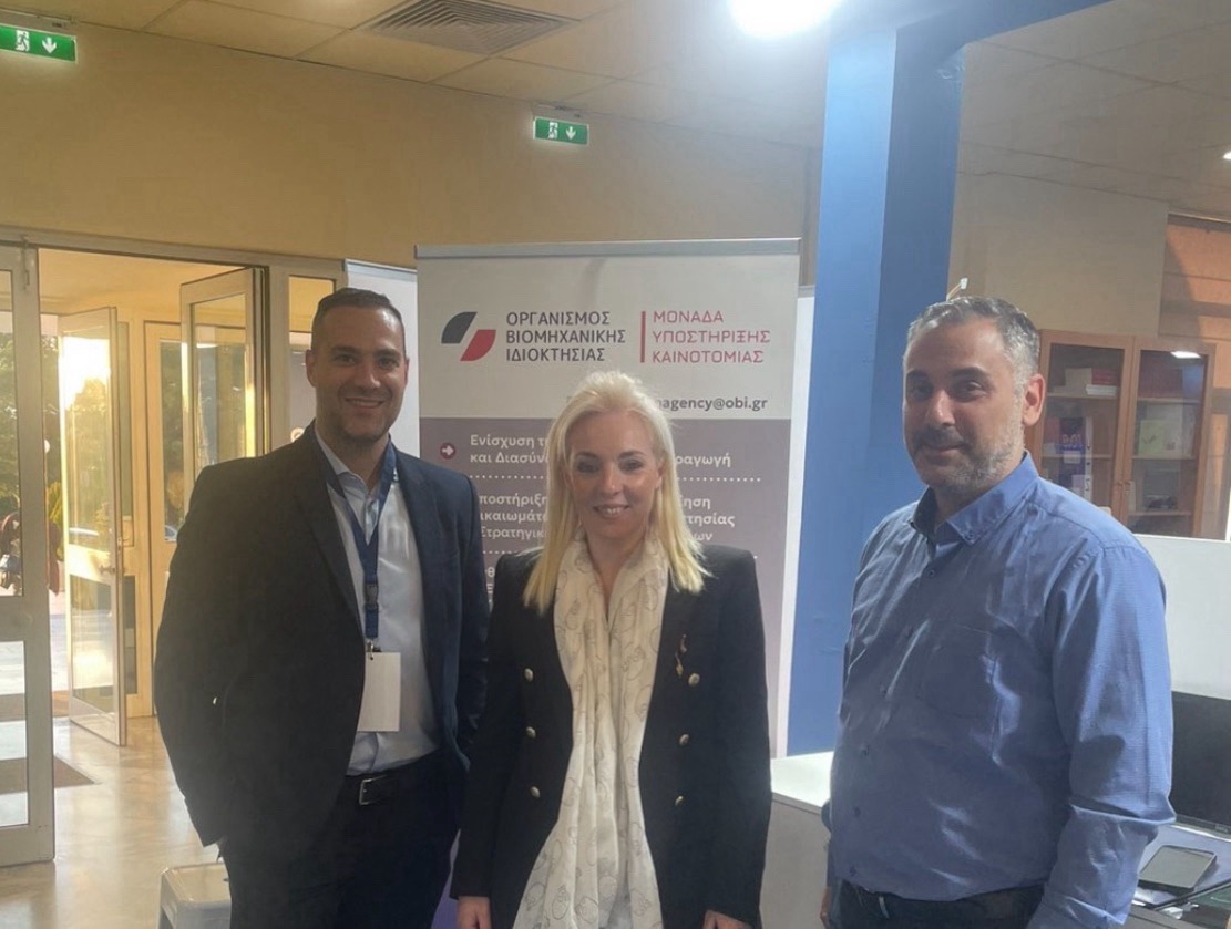 At the Organisation’s booth, Ms. Vivian Makri, Head of the Innovation Dissemination Department at the Directorate of Technological Information, Mr. Anastasios Kardaris, associate of the Directorate of Technological Information, and Mr. Theodoros Chalkidis, associate of the Directorate of Technological Information, based at the OBI Regional Office in Patras, provided personalized guidance on patents, trademarks, industrial designs, and international protection, serving as a hub for information and strategic support for the innovation ecosystem.