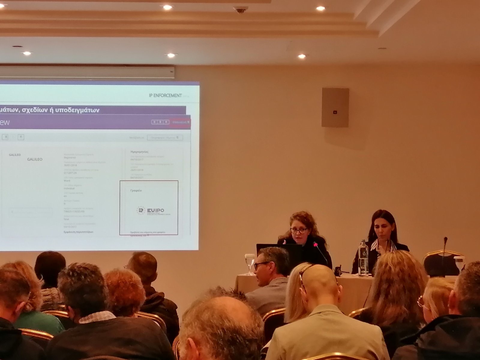 Από τον ΟΒΙ η κυρία Μυρτώ Λάμπρου Μάουρερ ενημέρωσε τους παρευρισκόμενους για την προστασία που παρέχεται με τα δικαιώματα βιομηχανικής ιδιοκτησίας, επισημαίνοντας τι πρέπει να εξετάζεται κατά την πραγματοποίηση ελέγχων των διωκτικών αρχών. Παρουσίασε, επίσης, το Εθνικό Μητρώο Τίτλων του ΟΒΙ για την ανάκτηση πληροφοριών αναφορικά με την ισχύ δικαιωμάτων.
