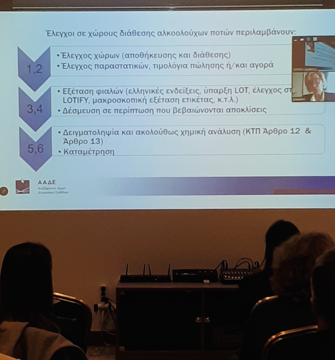Η Δρ. Πετρούλα Ταραντίλη, Προϊσταμένη της Χημικής Υπηρεσίας Κεντρικής Μακεδονίας της Γενικής Διεύθυνσης του Γενικού Χημείου του Κράτους της ΑΑΔΕ, παρουσίασε τα οφέλη της συνεργασίας των αρχών στην καταπολέμηση του παράνομου εμπορίου αλκοολούχων ποτών και μοιράστηκε την εμπειρία της Αρχής από τους ελέγχους αλκοολούχων ποτών.