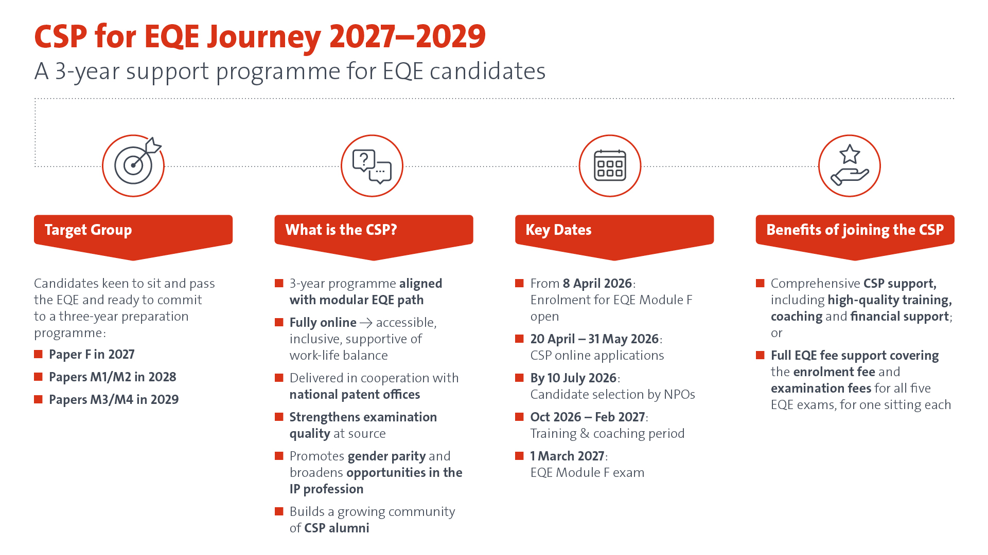 Το πρόγραμμα έχει σχεδιαστεί ώστε να συμβάλει στη δημιουργία ενός περισσότερο συμπεριληπτικού και ποικιλόμορφου επαγγέλματος στον χώρο των ευρωπαϊκών διπλωμάτων ευρεσιτεχνίας, αυτό του πιστοποιημένου ειδικού πληρεξουσίου, βελτιώνοντας τη γεωγραφική εκπροσώπηση και την ισορροπία μεταξύ των φύλων, ενώ παράλληλα παρέχει στους υποψήφιους που επιθυμούν να λάβουν μέρος στις εξετάσεις, την υποστήριξη που χρειάζονται για να επιτύχουν και στις πέντε γραπτές δοκιμασίες του EQE και να αποκτήσουν την ιδιότητα του πιστοποιημένου ειδικού πληρεξουσίου ενώπιον του EPO.