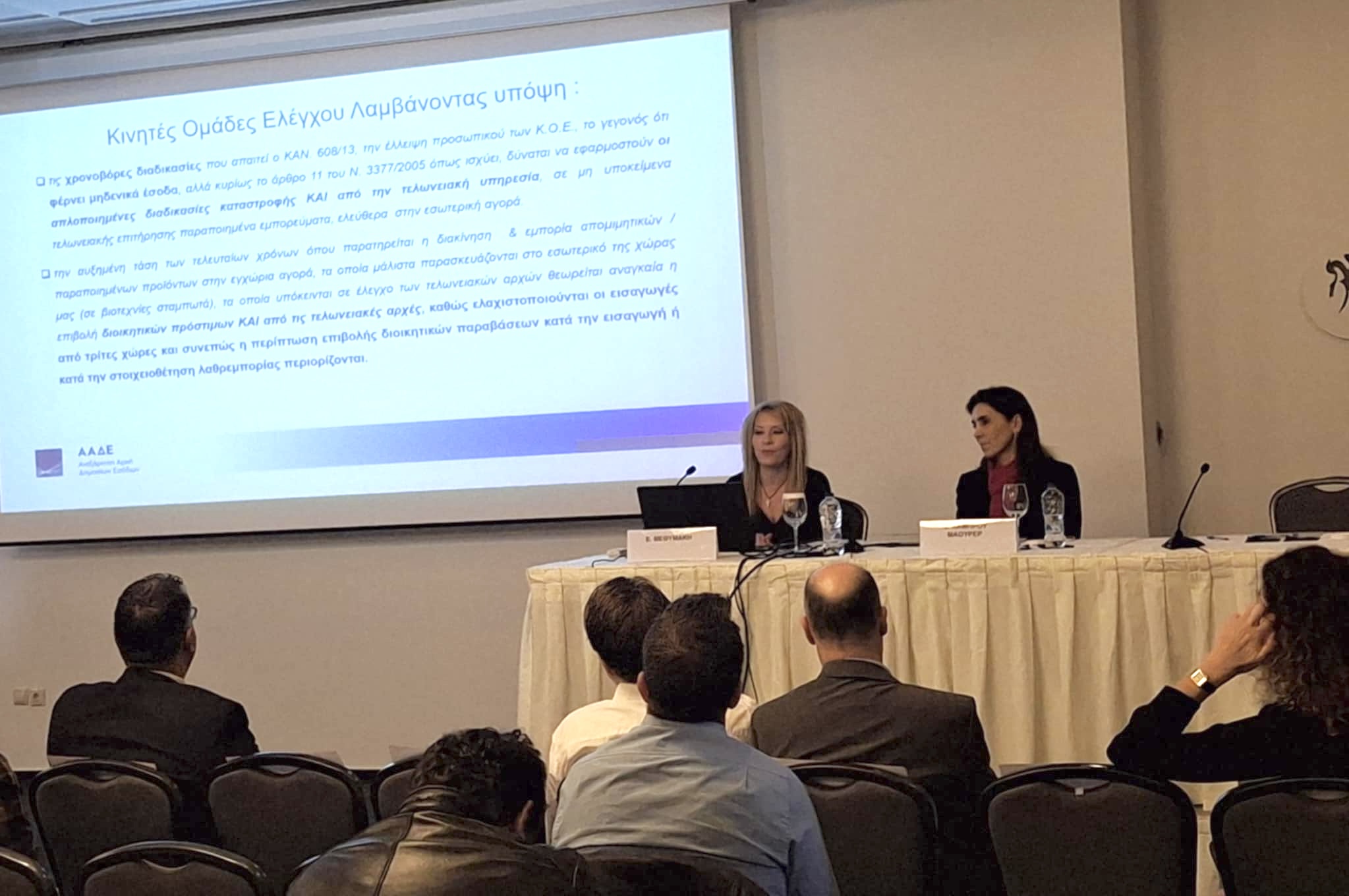 Στη συνέχεια εκπρόσωποι εταιριών στην Ελλάδα πραγματοποίησαν εκπαίδευση για την αναγνώριση απομιμητικών/παραποιημένων προϊόντων, παρουσιάζοντας παραδείγματα από κατασχέσεις προïόντων.