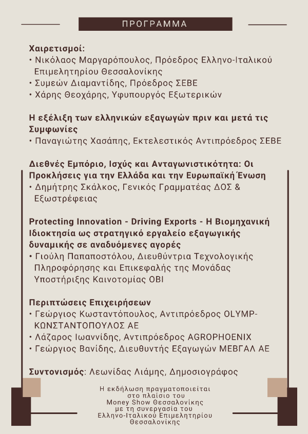 Σας ενημερώνουμε πως ο Οργανισμός Βιομηχανικής Ιδιοκτησίας (ΟΒΙ) συμμετέχει ως υποστηρικτής και ομιλητής στην εκδήλωση του Συνδέσμου Εξαγωγεών (ΣΕΒΕ), στο πλαίσιο του Money Show Θεσσαλονίκης (21 Μαρτίου 2026), με τίτλο: